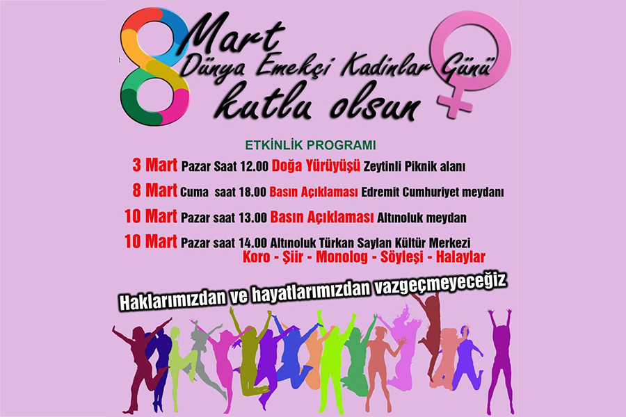 3 Mart Pazar saat 12.00’de Zeytinli Piknik Alanı’nda yapacakları doğa yürüyüşü ile 8 Mart etkinlikleri startını verecek Edremitli kadınlar, Edremit Cumhuriyet Meydanı’nda 18.00’de 8 Mart açıklama yapacak. Kadınlar 10 Mart Pazar günün Altınoluk Meydanı’nda saat 13.00’te bir basın açıklaması yaparken, saat 14.00’te de Altınoluk Türkan Saylan Kültür Merkezinde şarkılı, müzikli, halaylı etkinlik düzenleyecek.