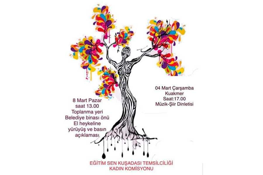 Eğitim Sen Kuşadası Temsilciliği 4 Mart Çarşamba 17.00’de Kuakmer’de şiir müzik dinletisi düzenliyor, 8 Mart günü de Belediye binası önünde toplanıp El Heykeline yürüyerek 8 Mart açıklaması yapıyor.
