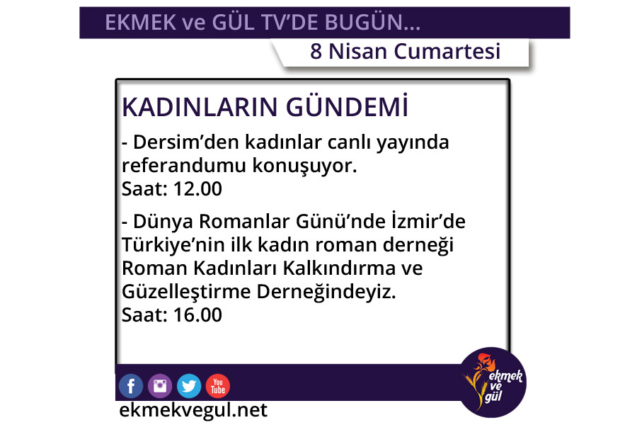 Dersim'den kadınlar canlı yayında referandumu konuşuyor. Ayrıca 8 Nisan Dünya Romanlar Günü'nde Türkiye'nin ilk roman kadın derneği Roman Kadınları Kalkındırma ve Güzelleştirme Derneğindeyiz...