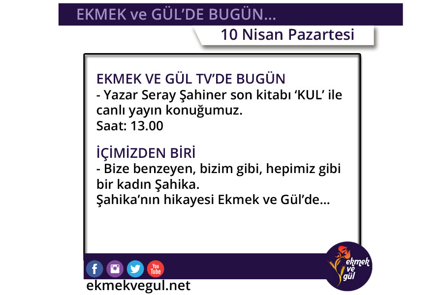 Son kitabı 'KUL' ile yazar Seray Şahiner canlı yayın konuğumuz kaçırmayın... İçimizden biri, hepimiz gibi bir kadın 'Şahika'nın hikayesi' Ekmek ve Gül'de sizinle...