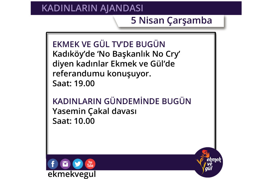 Ekmek ve Gül TV'de bugün Kadıköy'de NoBaşkanlıkNoCry diyen kadınlar referandum gündemiyle canlı yayında sizinle olacak. Bugün ayrıca Yasemin Çakal davasını da Ekmek ve Gül'den takip edebilirsiniz.