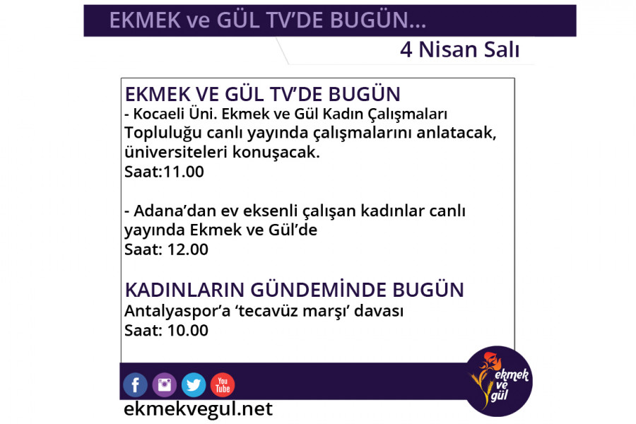 Ekmek ve Gül TV'de bugün Adana'dan ev eksenli çalışan kadınlar canlı yayında sizinle olacak. Bugün ayrıca Antalya'da 'tecavüz marşı' davası görülecek