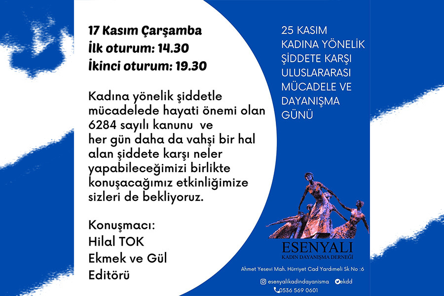 17 Kasım Çarşamba günü Editörümüz Hilal Tok'un konuşmacı olacağı, Esenyalı Kadın Dayanışma Derneği'nin çağrısıyla 25 Kasım panelinde kadınlar bir araya geliyor.