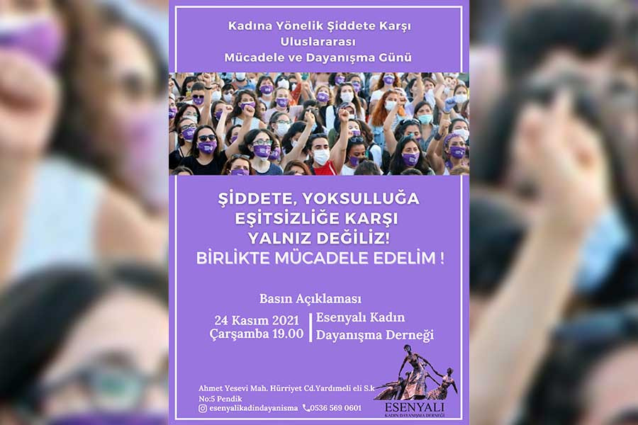 Esenyalı Kadın Dayanışma Derneği, 25 Kasım Kadına Yönelik Şiddete Karşı Uluslararası Mücadele ve Dayanışma Günü nedeniyle 24 Kasım'da basın açıklaması ve yürüyüş düzenleyecek.