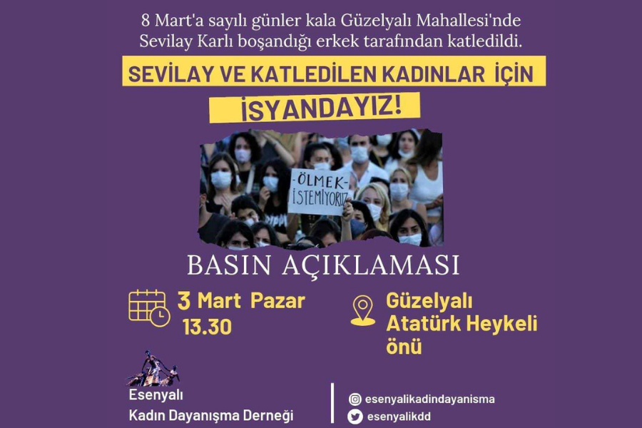 Esenyalı Kadın Dayanışma Derneği, boşandığı ve daha önce hakkında şikayette bulunduğu erkek tarafından öldürülen Sevilay Karlı ve katledilen tüm kadınlar için bir araya geliyor.