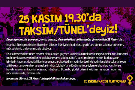 25 Kasım Kadın Platformu, 25 Kasım'da İstanbul'da kadınları şiddete karşı Taksim Tünel'de buluşmaya çağırıyor.