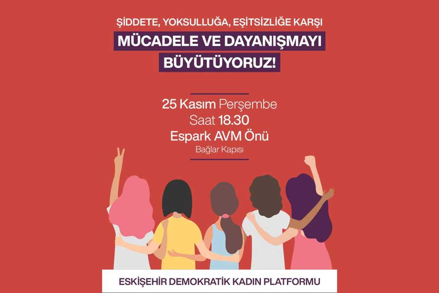 25 Kasım günü Türkiye’nin dört bir yanında kadınlar alanlara çıkacak. Eskişehir Demokratik Kadın Platformu da yaptığı çağrıyla Eskişehir’de yaşayan kadınları sokağa çağırdı. “Şiddete, yoksulluğa, eşitsizliğe karşı mücadele ve dayanışmayı büyütüyoruz” diyerek alanda olacak kadınlar 25 Kasım Perşembe günü 18.30’da Espark AVM önünde buluşacak.