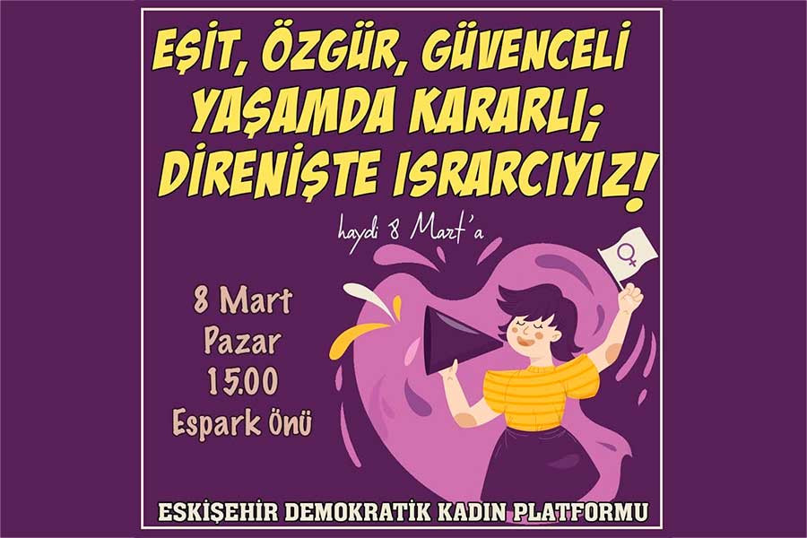 ‘Eşit, özgür, güvenceli yaşamda kararlı; direnişte ısrarcıyız’ diyen Eskişehir Demokratik Kadın Platformu 8 Mart’ta tüm kadınları Espark önünde toplanmaya çağırıyor.