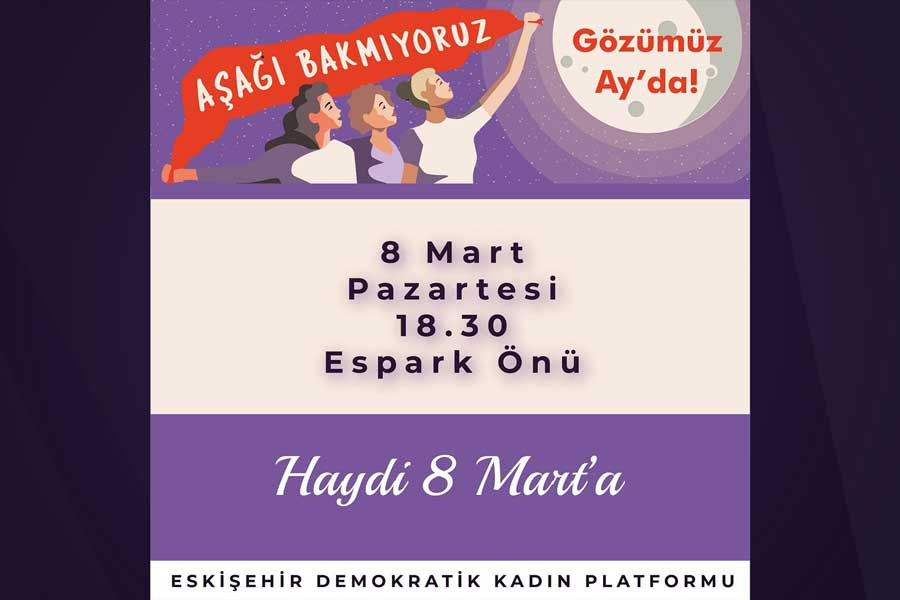 Bu 8 Mart’ta Eskişehir Demokratik Kadın Platformu olarak “Aşağı Bakmıyoruz, Gözümüz Ay’da!” diyeceğiz. Haklarımız, hayatlarımız ve birbirimiz için direnmeye devam edeceğimizi haykırmak için Espark Avm’de buluşup Adalar Mevkiine yürüyeceğiz. Zulme boyun eğmiyoruz, her zorluk karşısında dimdik duruyoruz! Göğe bakıyoruz… Eskişehirli tüm kadınları da dayanışmanın bir parçası olmak için 8 Mart Pazartesi günü saat 18.30’da Espark Avm’de buluşmaya davet ediyoruz. Yaşasın Kadın Dayanışması!