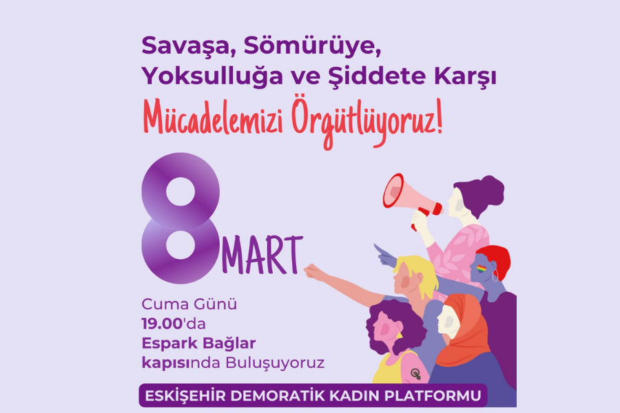 Eskişehir Kadın Platformu, 8 Mart günü 'Savaşa, sömürüye, yoksulluğa ve şiddete karşı mücadelemizi örgütlüyoruz' diyerek buluşuyor.