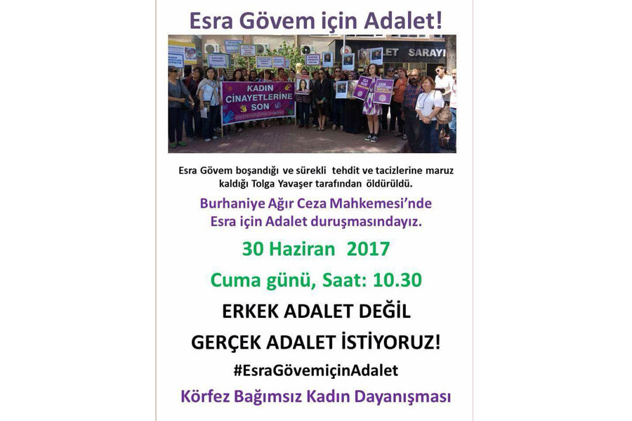 Balıkesir’in Edremit ilçesinde, hakkında koruma kararı bulunan 24 yaşındaki Esra Gövem, boşandığı eşi 25 yaşındaki Tolga Yavaşer tarafından iki yaşındaki kızının gözleri önünde katledilmişti. Burhaniye Ağır Ceza Mahkemesinde 30 Haziran Cuma Günü görülecek dava için Körfez Bağımsız Dayanışma Ağı tüm kadınlara kadınlar çağrı yaptı.