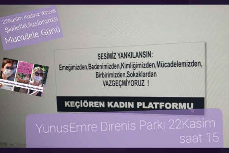Keçiören Kadın Platformu 25 Kasım’a giderken 22 Kasım Pazar 15.00’te Yunus Emre Direniş Parkı’nda 25 Kadım açıklaması yapıyor.