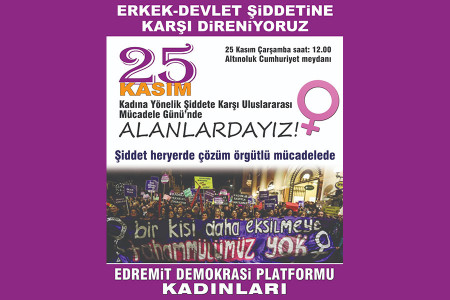 Edremit Demokrasi Platformu Kadınları tüm kadınları 25 Kasım'da saat 12.00'de Altınoluk Cumhuriyet Meydanı'na basın açıklamasına çağırıyor.