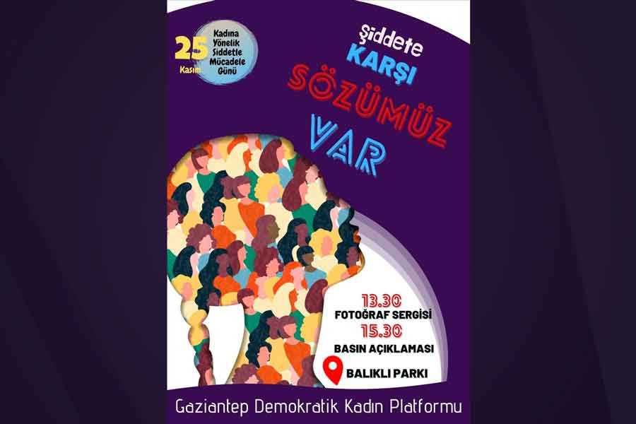 Gaziantep Demokratik Kadın Platformu 25 Kasım Kadına Yönelik Şiddete Karşı Uluslararası Mücadele ve Dayanışma Günü’nde ‘Şiddete karşı sözümüz var’ şiarıyla açıklama yapacak.