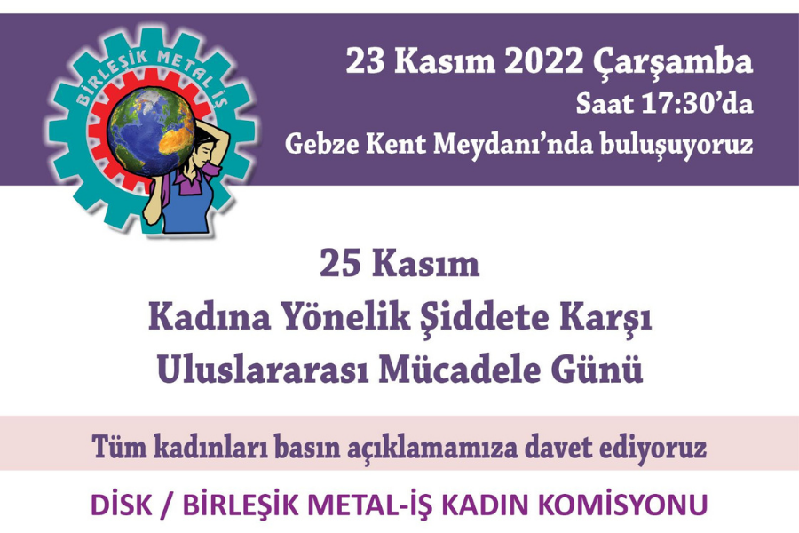 Gebze Birleşik Metal-İş Kadın Komisyonu'nun çağrısıyla işçi kadınlar 25 Kasım için Gebze Kent Meydanı'nda olacak.