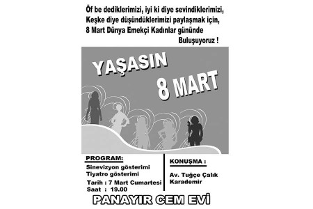 Bursa Panayır Mahallesi Cemevi 8 Mart’a etkinliği düzenliyor. Avukat Tuğçe Çalık Karademir’in katılımıyla gerçekleşecek etkinlikte sinevizyon gösterimi de yapılacak.
