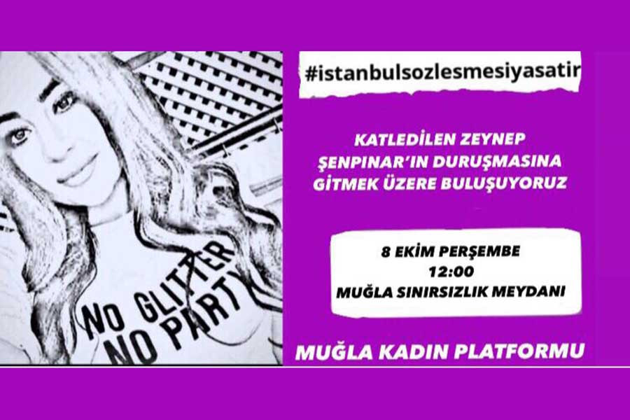 Dava öncesi saat 12’de Muğla Sınırsızlık Meydanı’na çağrı yapan Muğla Kadın Platformu, tüm kadınları “Zeynep İçin adalet” demeye çağırıyor.