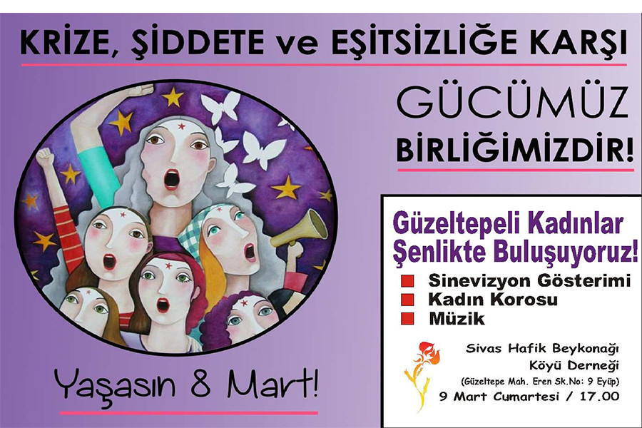 İstanbul’un Eyüp ilçesi Güzeltepe Mahallesi’nde yaşayan kadınlar Ekmek ve Gül şenliğinde bir araya geliyor. Krize, şiddete ve eşitsizliğe karşı gücümüz birliğimiz’şiarıyla bir araya gelecek olan kadınların programında sinevizyon gösterimi, kadın korosu ve müzik var. Kadınlar 9 Mart Cumartesi günü saat 17:00’de Sivas Hafik Beykonağı Köyü Derneğine tüm kadınları davet ediyor.
