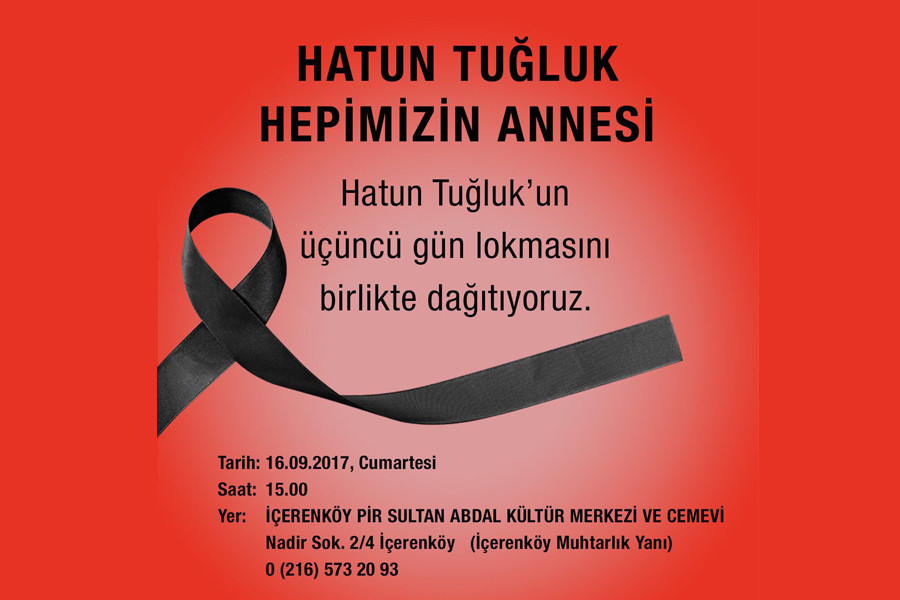 Öte yandan Hatun Tuğluk’a son görevlerini yerine getirmek isteyenlerse 3. gün lokması dağıtımı için çağrı yapıyor. İçerenköy Pir Sultan Abdal Kültür Merkezi ve Cemevinde yapılacak olan lokma dağıtımına her dinden, mezhepten ve milleten kişi ayrım yapılmaksızın davet ediliyor.