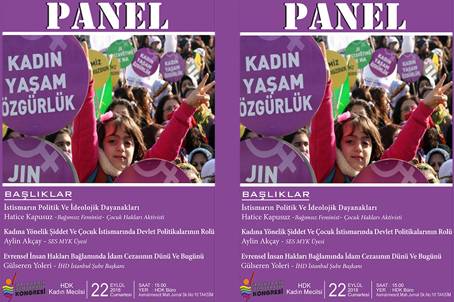 HDK Kadın Meclisi “İstismarın Politik ve İdeolojik Dayanakları, Kadına Yönelik Şiddet ve Çocuk İstismarında Devlet Politikalarının Rolü, Evrensel İnsan Hakları Bağlamında İdam Cezasının Dünü ve Bugünü” başlıklarının tartışılacağı bir panel düzenliyor. 22 Eylül Cumartesi günü, saat 15.00’te başlayacak olan panel Taksim’deki HDK bürosunda yapılacak.