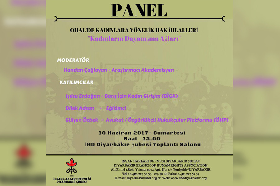 İHD Diyarbakır Şubesi Toplantı Salonu’nda yapılacak panelde Barış İçin Kadın Girişimi Üyesi Işılsu Erdoğan, Eğitimci Dilek Adlan ve Özgürlükçü Hukukçular Platformunda Avukat Gülşen Özbek konuşmacı olarak katılacak.