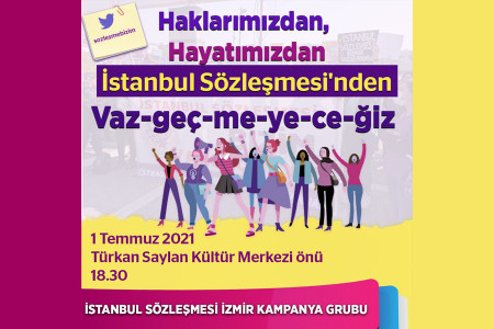 İstanbul Sözleşmesi İzmir Kampanya Grubu 1 Temmuz'da 18.30'da Türkan Saylan Kültür Merkezi önüne yan yana gelmeye çağırıyor.