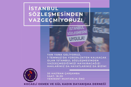 Kocaeli Ekmek ve Gül Kadın Dayanışma Derneği 30 Haziran Çarşamba günü 18.30'da kadınları yan yana gelmeye ses çıkarmaya çağırıyor.