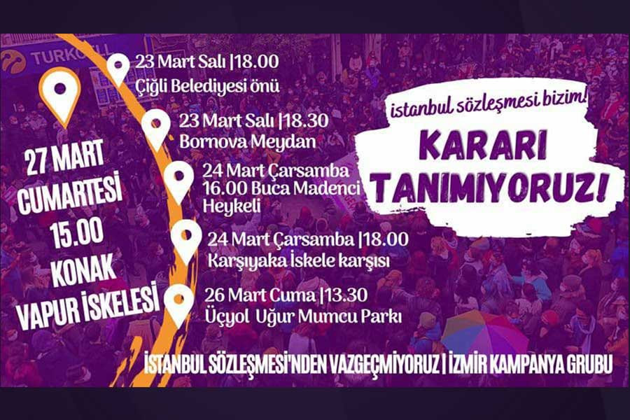 “İstanbul Sözleşmesi Bizim, kararı tanımıyoruz” diyen İstanbul Sözleşmesi’nden Vazgeçmiyoruz İzmir Kampanya Grubu tüm hafta boyunca İzmir’in çeşitli noktalarında kadınları alanlarda olmaya çağırıyor.