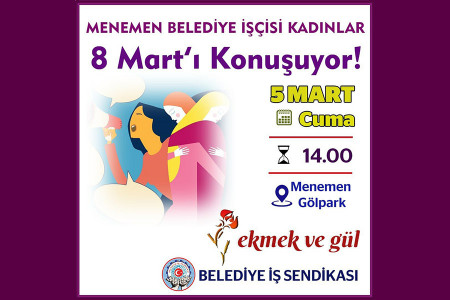 Belediye İş Sendikası üyesi kadın işçilerle bir araya gelerek sorunlarımızı ve taleplerimizi konuşmak için 5 Mart Cuma günü saat 14.00'de Menemen Gölpark'ta buluşuyoruz