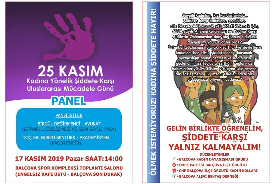 İzmir’de kadınlar ‘Ölmek istemiyoruz, kadına şiddete hayır, gelin birlikte öğrenelim, şiddete karşı yalnız kalmayalım’ diyerek panel düzenliyor.