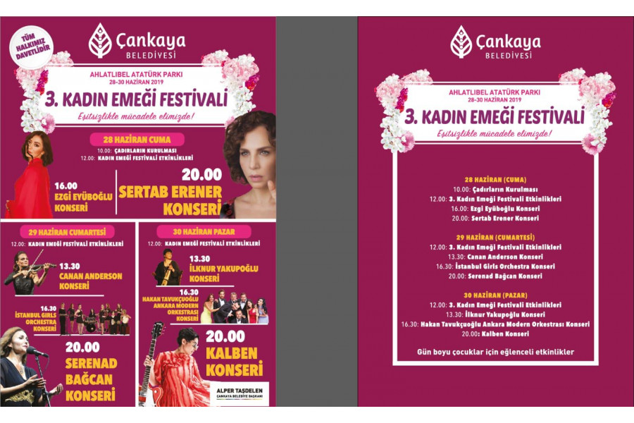 Çankaya Belediyesi tarafından düzenlenen Kadın Emeği Festivali başlıyor. Ahlatlıbel Atatürk Parkı’nda bu yıl 3.’sü düzenlenecek olan festivalde yaklaşık 500 kadın stand açacak. Ahşap eşyalardan keçe işlere, takıdan örgü bebeklere pek çok el emeği ürünün satışa sunulacağı festivalde Çankaya Belediyesi, kadınların satışlardan elde ettiği gelirin tamamen kendilerine kalmasını sağlayacak.Festivalle eşitlikçi bir toplumun geliştirilmesi, mevcut eşitsizliklerin giderilmesi, kadın emeğinin öne çıkarılması ve el emeği ürünlerin pazardaki yerini alabilmesi amaçlanıyor.