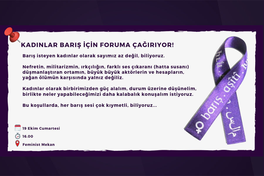 Kırgınlığımız, kızgınlığımız, endişemiz, içimizdeki isyanla kadınlar olarak birbirimizden güç alalım, durum üzerine düşünelim, birlikte neler yapabileceğimizi daha kalabalık konuşalım istiyoruz. Bu koşullarda, her barış sesi çok kıymetli, biliyoruz. Geçen hafta başladık, bu hafta birlikte daha kalabalık yol almak dileğiyle..