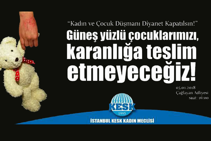 “Susmuyoruz! Geleceğimize, çocuklara, kadınlara, tüm doğaya kısaca tüm yaşama sahip çıkıyoruz” diyen KESK üyesi kadınlar 5 Ocak Cuma günü saat 16.00’da Çağlayan Adliyesi önünde buluşarak Diyanet İşleri Başkanlığı hakkında suç duyurusunda bulunacak.