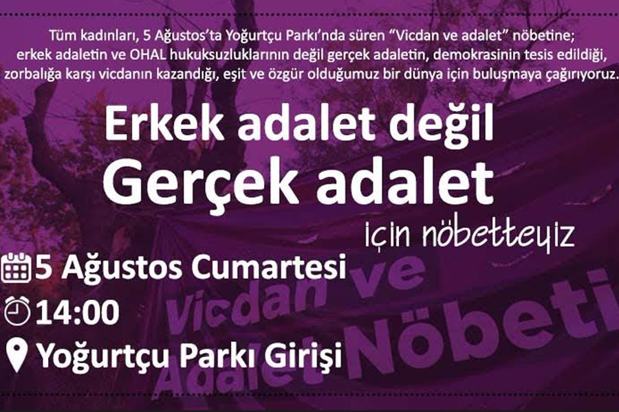 25 Temmuz’da Amed’de başlayan, daha sonra 1 Ağustos’ta İstanbul Kadıköy’de Yoğurtçu Parkı’nda devam eden ‘Vicdan ve Adalet Nöbeti’ne kadınlar da ‘adalet’ talebini dile getirmek için katılıyor. Kadınlar “Erkek adalet değil, gerçek adalet” şiarı ile 5 Ağustos Cumartesi Yoğurtçu Parkı’nda olacak.