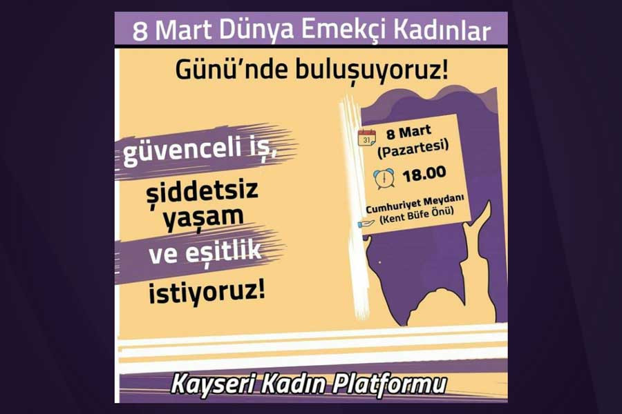 Kayseri Kadın Platformu 8 Mart Pazartesi Günü ‘Güvenceli iş, şiddetsiz yaşam ve eşitlik istiyoruz’ şiarıyla 18.00’de Cumhuriyet Meydanı’nda olacak.