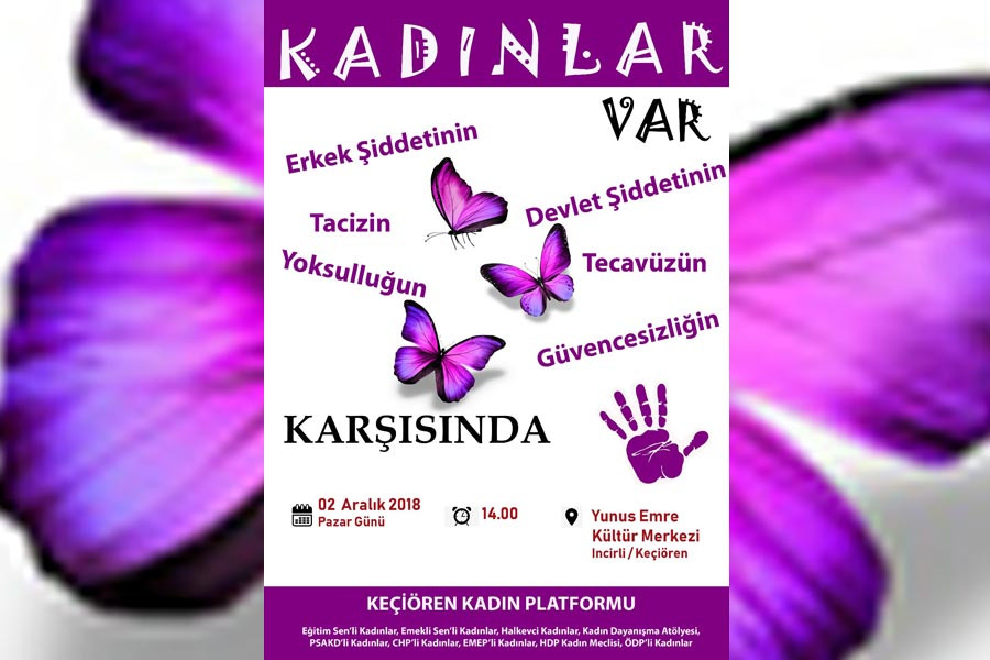 Keçiören Kadın Platformu 2 Aralık’ta kadına yönelik şiddete, tacize, kadınları daha fazla yoksullaştıran ve güvencesiz politikalara karşı bir araya gelecek. Keçiören Yunus Emre kültür merkezinde Saat 14.00’da gerçekleşecek etkinlikte kadınlar taleplerini konuşacak, hazırladıkları etkinliklerle “kadınlar var” diyecek.