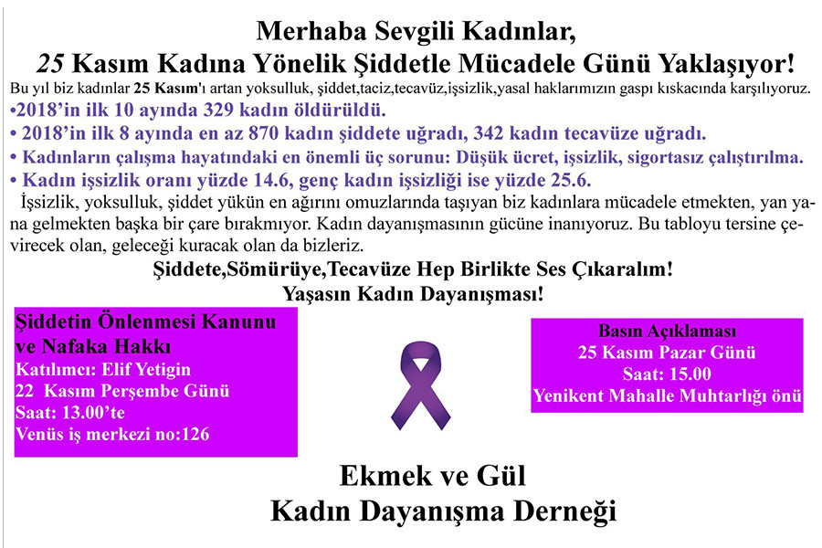 22 Kasım Perşembe günü 13.00’te Venüs İş Merkezinde Elif Yetigin’in konuşmacı olduğu “Şiddetin Önlenmesi Kanunu ve Nafaka” konulu panel düzenleyecek olan Dernek, 25 Kasım Pazar günü 15.00’te Yenikent Mahallesi Muhtarlığı önünde 25 Kasım açıklaması yapacak.
