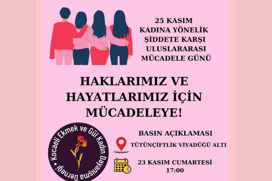 Kocaeli Ekmek ve Gül Kadın Dayanışma Derneği, 25 Kasım'a giderken kadınları 'Haklarımız ve hayatlarımız için mücadeleye' şiarıyla yapacakları basın açıklamasına çağırıyor.