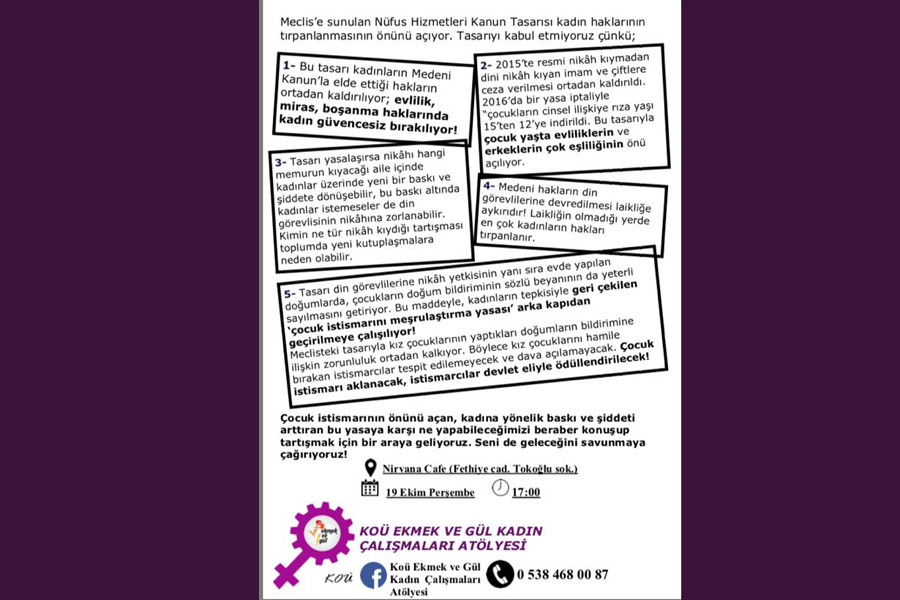 Meclis’e sunulan Nüfus Hizmetleri Kanun Tasarısı kadınların medeni haklarının tırpanlanmasının önünü açacak pek çok madde içeriyor. Tasarıyı kabul etmiyoruz çünkü;