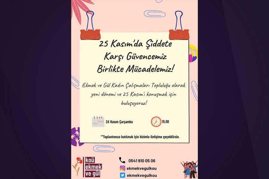 ‘Şiddete Karşı Güvencemiz Birlikte Mücadelemiz’ diyen Kocaeli Üniversitesi Ekmek ve Gül Kadın Çalışmaları Topluluğu 25 Kasım öncesi bir buluşma yapıyor.