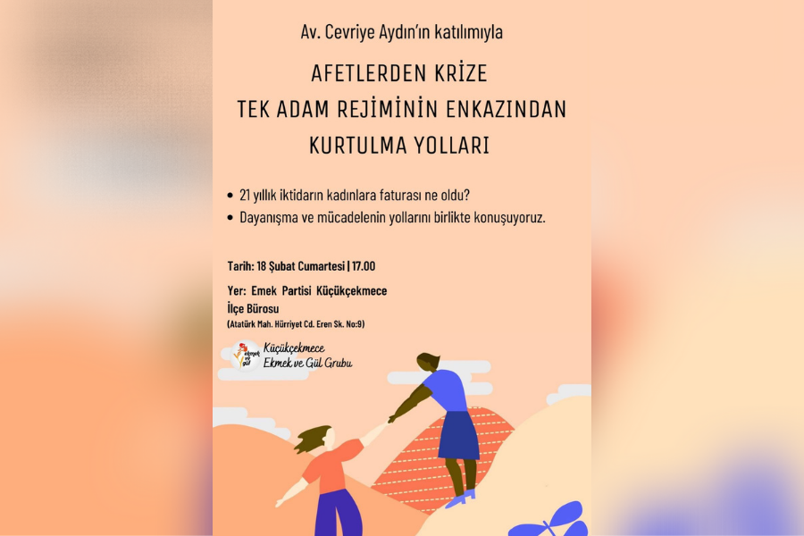 Küçükçekmece Ekmek ve Gül Grubu Avukat Cevriye Aydın'ın katılımıyla afetlerden krize tek adam iktidarının enkazından kurtulma yollarını tartışacak.