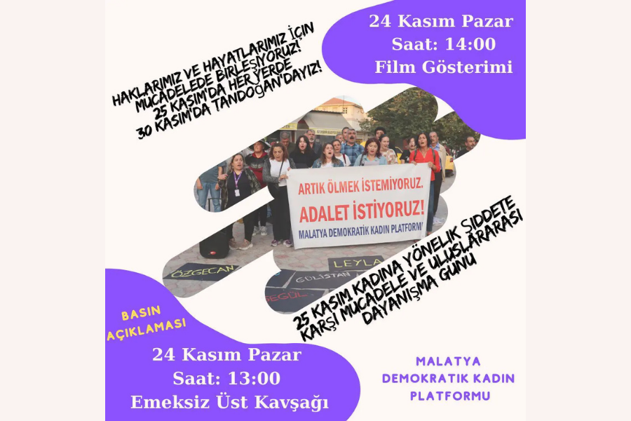 Malatya Demokratik Kadın Platformunun çağrısıyla kadınlar 24 Kasım günü basın açıklamasında buluşacak. Açıklamanın ardından kadınlar film gösteriminde yan yana gelecek.