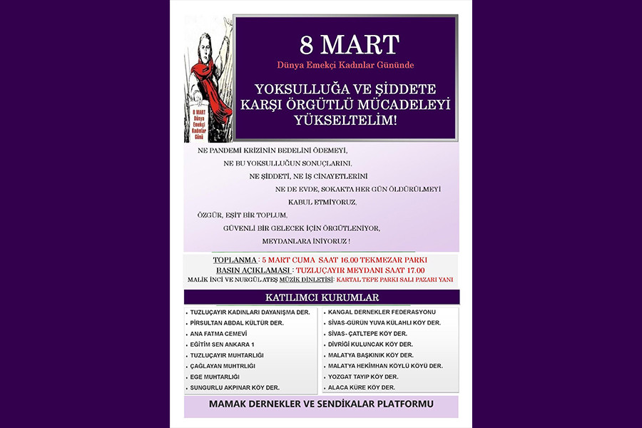 Mamak Dernekler ve Sendikalar Platformu ‘Yoksulluğa ve şiddete karşı örgütlü mücadeleyi büyütelim’ şiarı ile tüm kadınları 5 Mart Cuma günü 16.00'de Tekmezar Parkı’ndan Tuzluçayır Meydanı’na yapacakları yürüyüş ve Tuzluçayır Meydanı’nda 17.00’de yapacakları basın açıklamasında yan yana olmaya çağırdı.