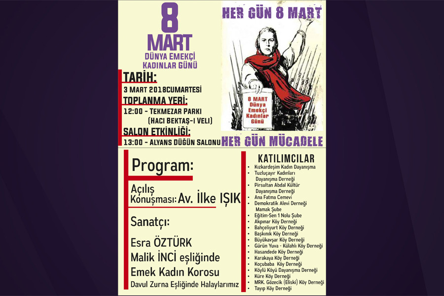 Etkinliğin açılış konuşmasını yapacak olan Avukat İlke Işık’ın katılımının yanı sıra Esra Öztürk, Malik İnci ve Emek Kadın Korosunun türküleride kadınları yalnız bırakmayacak. Etkinlik 3 Mart günü saat 13.00’da Alyans Düğün Salonu’nda gerçekleşecek.