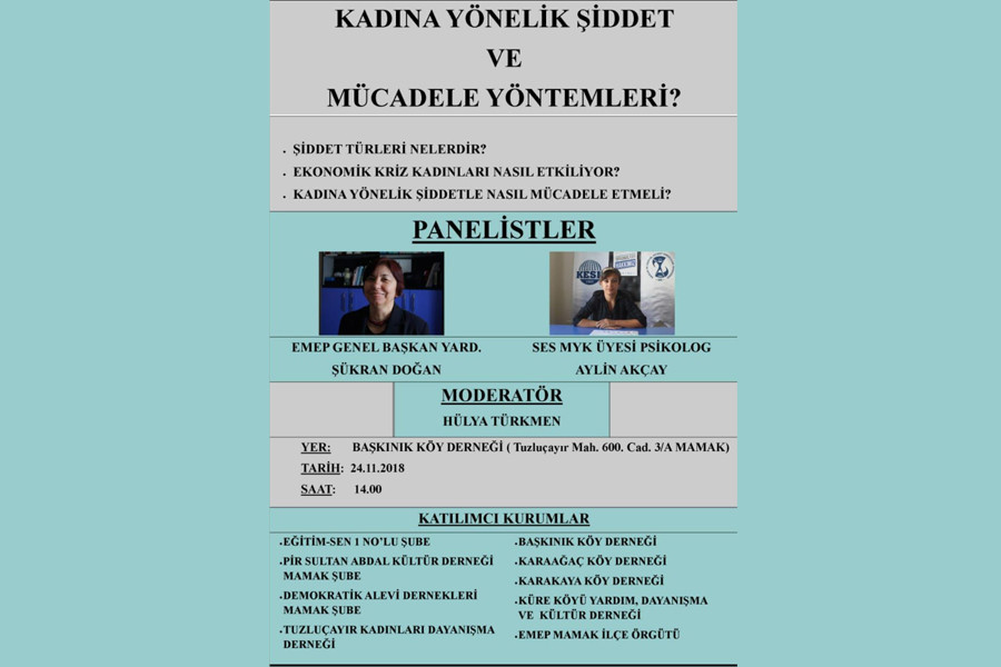 25 Kasım Kadına Yönelik Şiddete Karşı Uluslararası Mücadele ve Dayanışma Günü yaklaşırken, Emek Partisi Mamak ilçe örgütünün çağrısıyla bir araya gelen yöre, köy ve kadın derneklerinden kadınlar EMEP Genel Başkan Yardımcısı Şükran Doğan ve SES MYK Üyesi, Psikolog Aylin Akçay ile şiddetin türlerini, ekonomik krizin kadına yansımalarını ve şiddetle mücadele yöntemlerini tartışmak için buluşuyor.