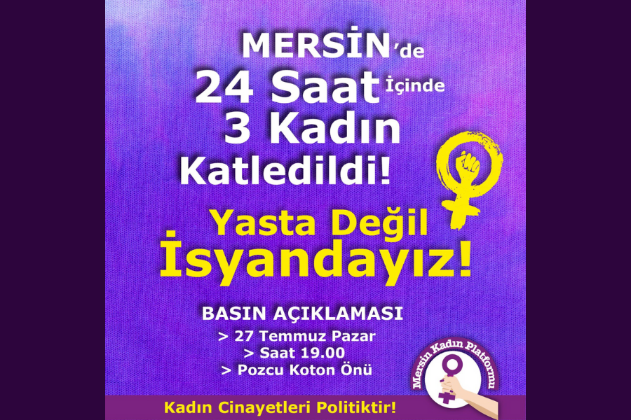 Mersin Kadın Platformu, yaptığı eylem çağrısında “Kadın katliamlarının, şiddet sarmalının ortasında hayatlarımız, haklarımız için direniyoruz. Yasta değil isyandayız! Katledilen kadınların isyanını yükseltiyoruz!” dedi. Bugün, saat 19.00’da Pozcu’da buluşmaya çağırdı.
