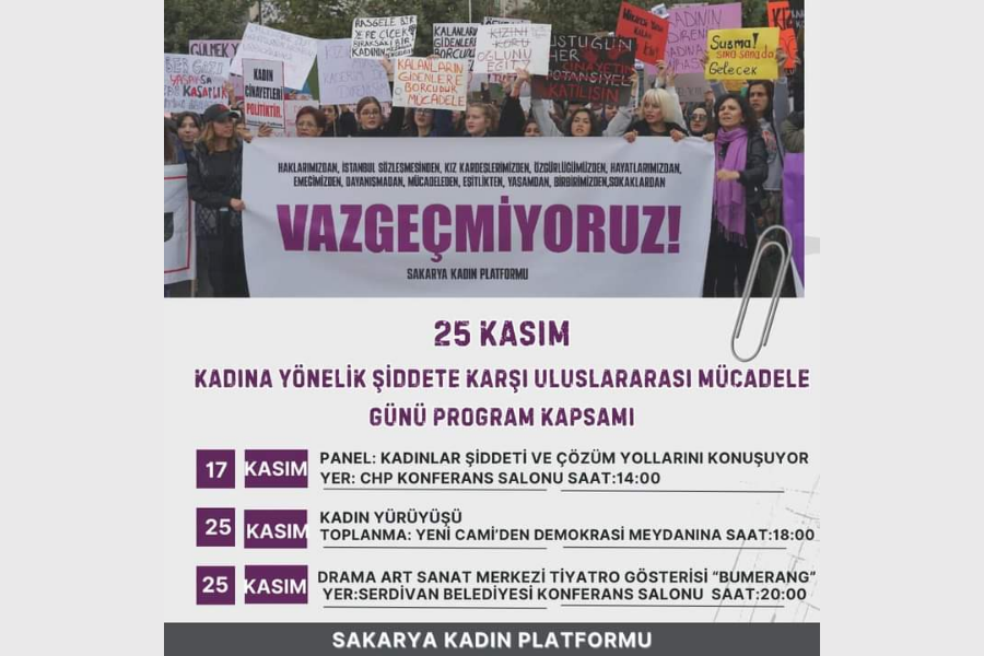 Sakarya Kadın Platformu kadınlarla 25 Kasım günü kadın yürüyüşünde buluşacak. Kadınlar yürüyüşün ardından 'Bumerang' isimli tiyatro oyununu izleyecek.