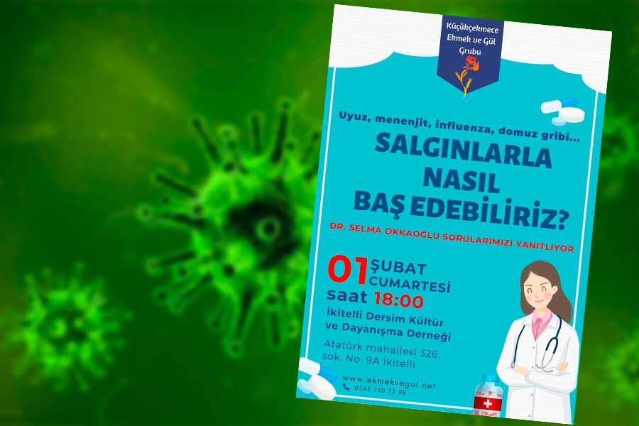 Uyuz, menenjit, influenze, domuz gribi... Mevsimsel ve toplumsal faktörler nedeniyle bu ara çokça konuştuğumuz salgın hastalıkları Dr. Selma Okkaoğlu ile konuşuyoruz. Küçükçekmece Ekmek ve Gül Grubunun düzenlediği etkinlik, 1 Şubat Cumartesi günü 18.00’de İkitelli Dersim Kültür ve Dayanışma Derneğinde. Etkinliğe tüm kadınlar davetlidir.