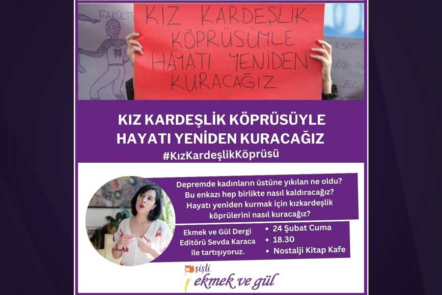 “Kız Kardeşlik Köprüsü ile hayatı yeniden kuracağız” sloganıyla yola çıkan kadınlar Ekmek ve Gül Editörü Sevda Karaca ile deprem bölgelerindeki kadılarla için oluşturulacak dayanışma ağlarını konuşacak.