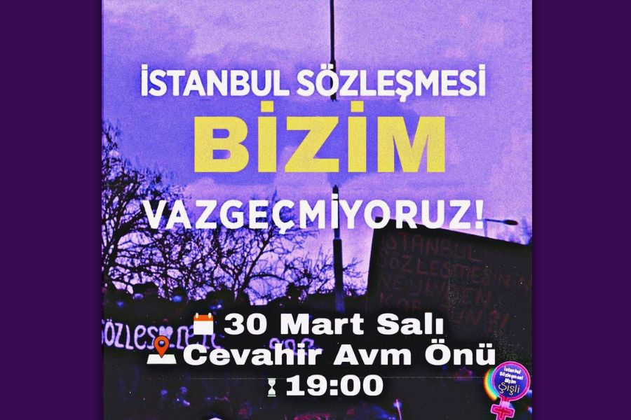 İstanbul Sözleşmesi Bizim Şişli Kampanya Grubu 30 Mart Salı günü saat 19:00’da Şişli Cevahir önünde “İstanbul Sözleşmesi’nden Vazgeçmiyoruz” demek için buluşacak.